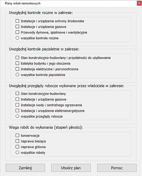 Plany robót remontowych są budowane w oparciu o utworzone protokoły kontroli rocznych i kontroli pięcioletnich, wykonane przez osoby uprawnione. W planach robót remontowych można uwzględniać protokoły sporządzone przez właściciela budynku jednorodzinnego z przeglądów roboczych. Dodatkowo, jako kryterium tworzenia planu robót remontowych, należy wskazać wagę robót do wykonania, czyli wybrać zakres pilności robót (jak czasami w środowisku budowniczych określa się tą czynność).![]() Plany robót remontowych uwzględniają wszystkie zalecenia i zakresy robót ze sporządzonych protokołów pokontrolych (i z przepisanych później do właściwych okien kontroli i przeglądów). Jeśli w oknie kontroli lub przeglądu roboczego są zaznaczone roboty do wykonania, to zostaną one ujęte w planie robót remontowych. W tym miejscu ważna uwaga: po wykonaniu robót remontowych, należy zaznaczyć opcję „roboty zostały wykonane" w oknie kontroli lub przeglądu odpowiadającemu zakresowi wykonanych robót, wówczas rzecz jasna te wykonane roboty nie będą uzwglądniane w planie robót remontowych. Rozporządzenie „w sprawie warunków technicznych użytkowania budynków mieszkalnych" zawiera wskazówki dotyczące zestawień robót remontowych. Przypomnę, moim zadaniem, najważniejsze. „Dane zawarte w protokołach kontroli powinny stanowić podstawę do sporządzenia zestawienia robót remontowych budynku. Zestawienie zawiera podział robót na: roboty konserwacyjne, naprawy bieżące, naprawy główne. Plany robót remontowych powinny być sporządzone z zachowaniem pierwszeństwa dla robót mających na celu: eliminację zagrożenia bezpieczeństwa użytkowników lokali i osób trzecich, zabezpieczenie przeciwpożarowe budynku, spełnienie wymagań ochrony środowiska, zachowanie zapobiegawczego charakteru remontu. Przy remontach budynku należy zapewnić: realizację robót w kolejności wynikającej z opracowanego planu remontów, bezpieczeństwo użytkowników i osób trzecich w trakcie prowadzenia robót, stosowanie rozwiązań technicznych, materiałowych i technologicznych ograniczających uciążliwość użytkowania lokali oraz podnoszących walory użytkowe" (koniec cytatu). Planując roboty remontowe, właściciel budynku jednorodzinnego, dla własnego dobra i dobra najbliższych, powinien kierować się wskazówkami zawartymi w rozporządzeniu; zbiór dostępnych opcji dla sporządzenia planu robót remontowych w programie GITO daje taką możliwość. Okno „Plany robót remontowych" mieści - obok pól wyboru i pól opcji - następujące przyciski: „Zamknij" - skrót z klawiatury ESC, „Utwórz plan" - skrót Ctrl + U, „Pomoc" - skrót Ctrl + M. Pola wyboru i pola opcji można aktywować wyłącznie przy pomocy myszki |