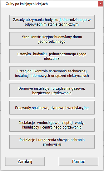Okienko „Quizy po kolejnych lekcjach" ułatwia dostęp do łatwych quizów, które należy wykonywać po każdej lekcji.![]() Niżej przedstawione są skróty klawiaturowe dla przywołania poszczególnych quizów po kolejnych lekcjach. Lekcja 1: „Zasady utrzymania budynku jednorodzinnego w odpowiednim stanie technicznym" - skrót Ctrl + J. Lekcja 2: „Stan konstrukcyjno-budowlany domu jednorodzinnego" - Ctrl + K. Lekcja 3: „Estetyka budynku jednorodzinnego i jego otoczenia" - Ctrl + E. Lekcja 4: „Przegląd i kontrola sprawności technicznej instalacji i domowych urządzeń elektrycznych" - Ctrl + I (jak w słowie Irena). Lekcja 5: „Domowe instalacje i urządzenia gazowe, bezpieczne użytkowanie" - Ctrl + G. Lekcja 6: „Przewody spalinowe, dymowe i wentylacyjne" - Ctrl + D. Lekcja 7: „Instalacje wodociągowe, ciepłej wody, kanalizacji i centralnego ogrzewania" - Ctrl + W. Lekcja 8: „Instalacje i urządzenia służące ochronie środowiska" - Ctrl + O. Te same skróty jak we wszystkich oknach: ESC - „Zamknij", Ctrl + M - „Pomoc". |