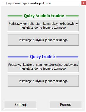 Komendy w okienku „Quizy sprawdzające wiedzę po kursie" uruchamiają quizy, które należy wykonać po zakończeniu kursu oceny stanu budynku. Dla obydwu obszernych zakresów oceny stanu budynku: „Podstawy kontroli, stan konstrukcyjno-budowlany i estetyka domu jednorodzinnego", „Instalacje budynku jednorodzinnego", dwa kursy są średnio trudne, także dwa kursy należą do trudnych.![]() Niżej - skróty klawiaturowe, które uruchamiają quizy. Quizy średnio trudne: „Podstawy kontroli, stan konstrukcyjno-budowlany i estetyka domu jednorodzinnego" - Ctrl + S, „Instalacje budynku jednorodzinnego" - Ctrl + N. Quizy trudne: „Podstawy kontroli, stan konstrukcyjno-budowlany i estetyka domu jednorodzinnego" - Ctrl + T, „Instalacje budynku jednorodzinnego" - Ctrl + I (I - jak w słowie Irena). ...i, jak we wszystkich oknach: ESC - „Zamknij", Ctrl + M - „Pomoc". |
