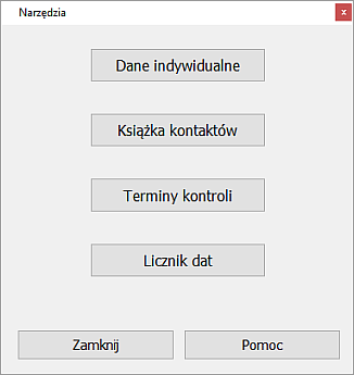 Okienko narzędzi programu GITO zawiera dojścia do aplikacji przydatnych dla właściciela sprawującego nadzór techniczny nad budynkiem jednorodzinnym. Naciśnięcie na właściwy przycisk prowadzi do wybranej aplikacji.![]() Skróty klawiaturowe dla uruchomienia poszczególnych aplikacji są następujące: Ctrl+D dla „Dane indywidualne", Ctrl+K dla „Książka kontaktów", Ctrl+T dla „Terminy kontroli", Ctrl+L dla „Licznik dat". Znaczenie dwu pozostałych przycisków, „Zamknij" i „Pomoc", jest oczywiste. Skróty z klawiatury dla uruchamiania tych przycisków to: ESC i Ctrl + M. |